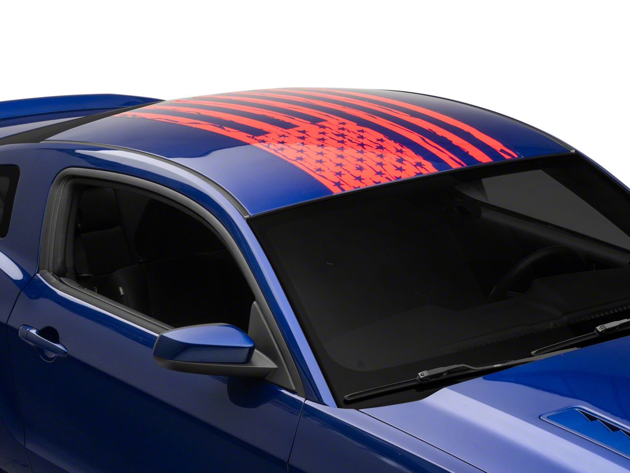 Patriotic Styling. Now you can add patriotic styling to your 2010-2014 Ford Mustang with this Distressed Flag Roof Panel Decal. Featuring a distressed American Flag design, this Decal will proudly show off your patriotism for the USA.