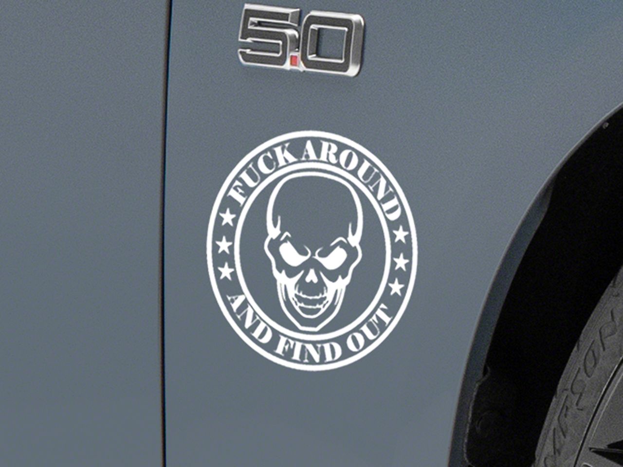 FAFO Skull Decal. A simple and inexpensive way to personalize the exterior styling of your vehicle is with a FAFO Skull Decal from SEC10. This Decal features a menacing skull design encircled with the text "F*ck Around and Find Out". This decal is ideal for those who stand on business.