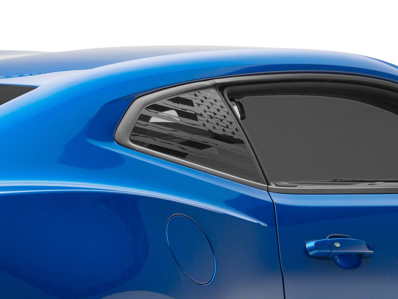 Patriotic Styling. Now you can add patriotic styling to your Chevrolet Camaro with these Distressed Flag Quarter Window Decals. Featuring a distressed American Flag design, these Decals will proudly show off your patriotism for the USA.