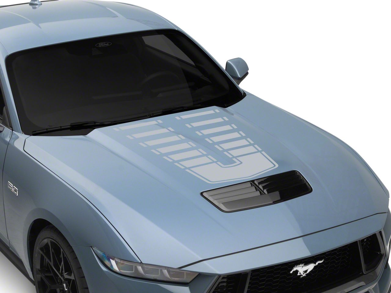 Application. This SEC10 Dashed Hood Decal; Silver is designed to fit 2024-2026 Ford Mustang models. Sold individually.
