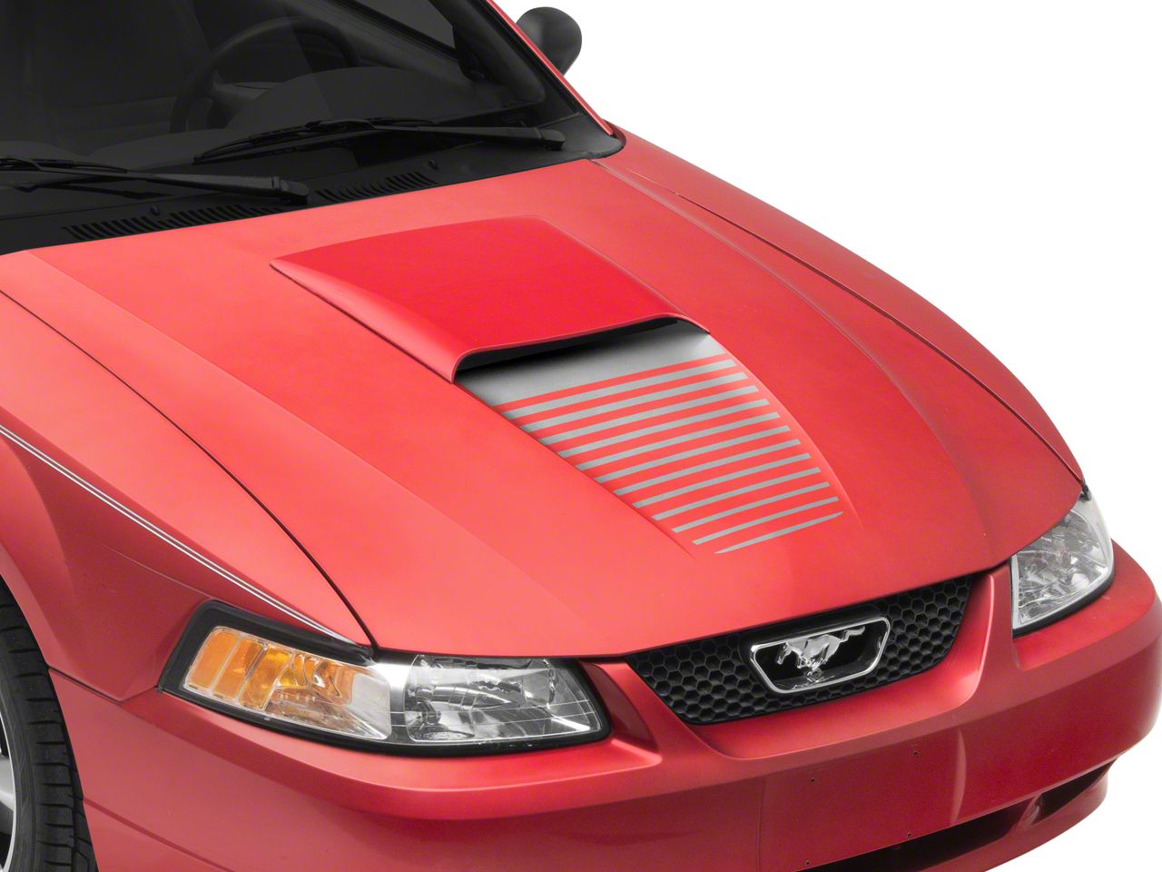 Application. This SEC10 Dashed Hood Decal; Silver is designed to fit 1999-2004 Ford Mustang models. Sold individually.