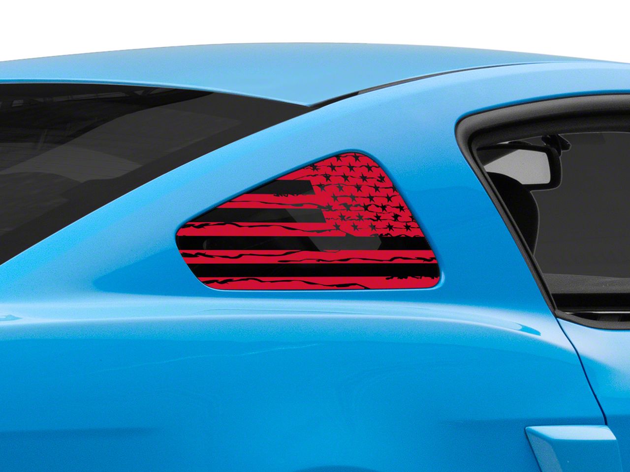 Distressed Flag Quarter Window Decals. A simple and inexpensive way to personalize the exterior styling of your Ford Mustang is with a set of SEC10 Distressed Flag Quarter Window Decals. These Decals feature a distressed American Flag design that will proudly show off your patriotism for the USA.