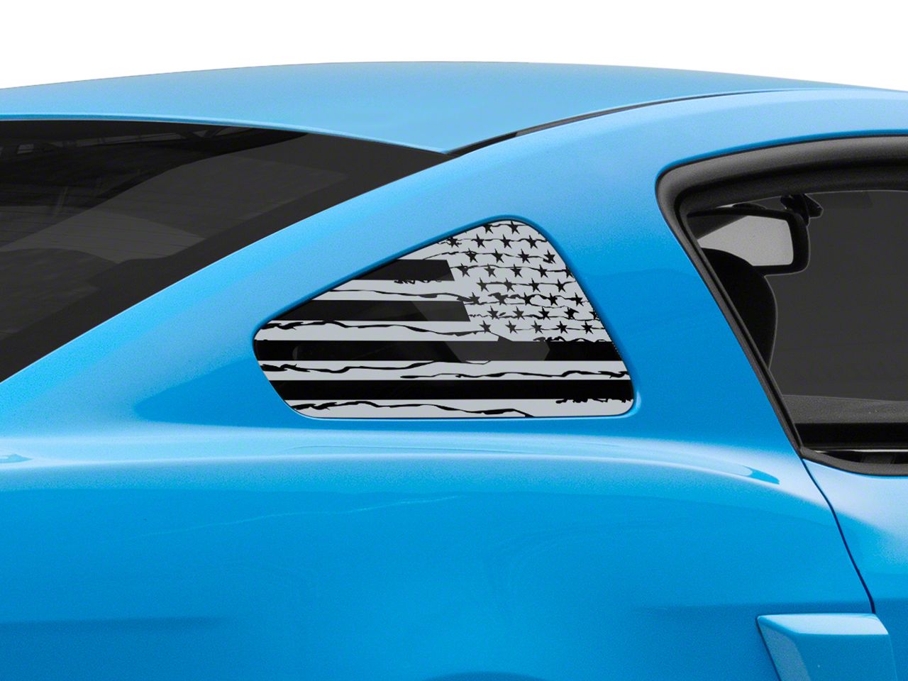 Distressed Flag Quarter Window Decals. A simple and inexpensive way to personalize the exterior styling of your Ford Mustang is with a set of SEC10 Distressed Flag Quarter Window Decals. These Decals feature a distressed American Flag design that will proudly show off your patriotism for the USA.