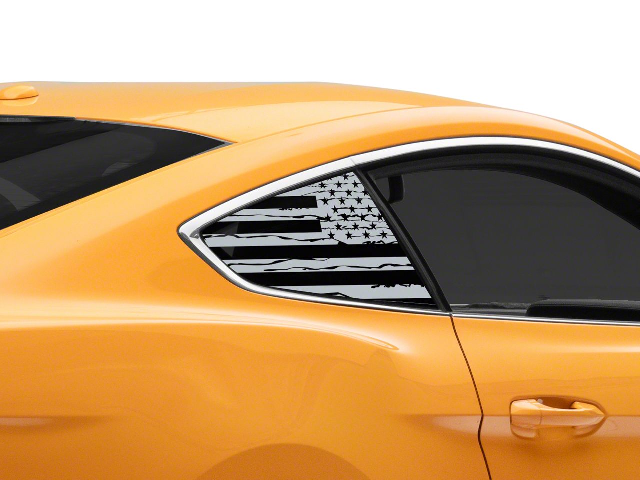 Distressed Flag Quarter Window Decals. A simple and inexpensive way to personalize the exterior styling of your Ford Mustang is with a set of SEC10 Distressed Flag Quarter Window Decals. These Decals feature a distressed American Flag design that will proudly show off your patriotism for the USA.