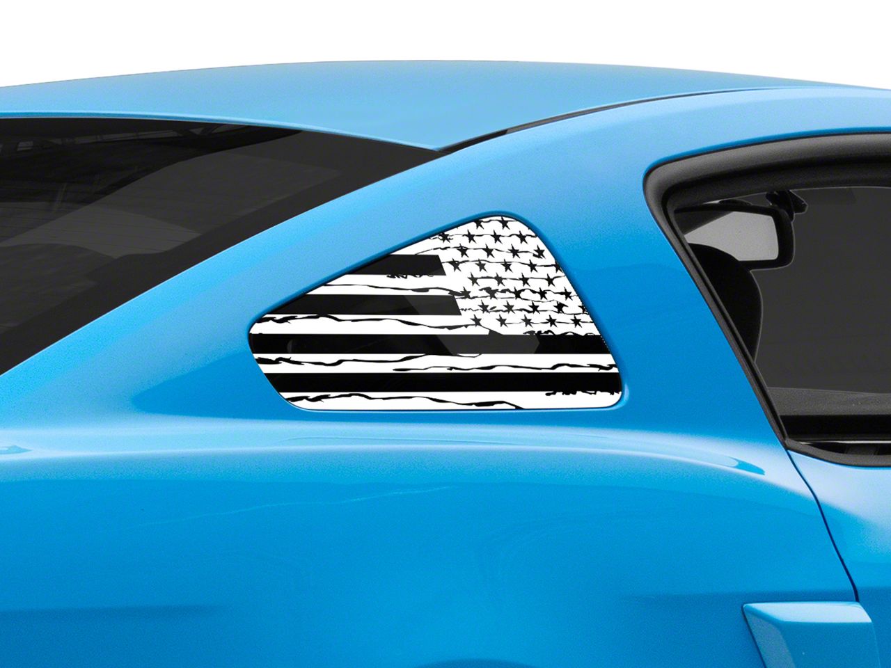 Distressed Flag Quarter Window Decals. A simple and inexpensive way to personalize the exterior styling of your Ford Mustang is with a set of SEC10 Distressed Flag Quarter Window Decals. These Decals feature a distressed American Flag design that will proudly show off your patriotism for the USA.