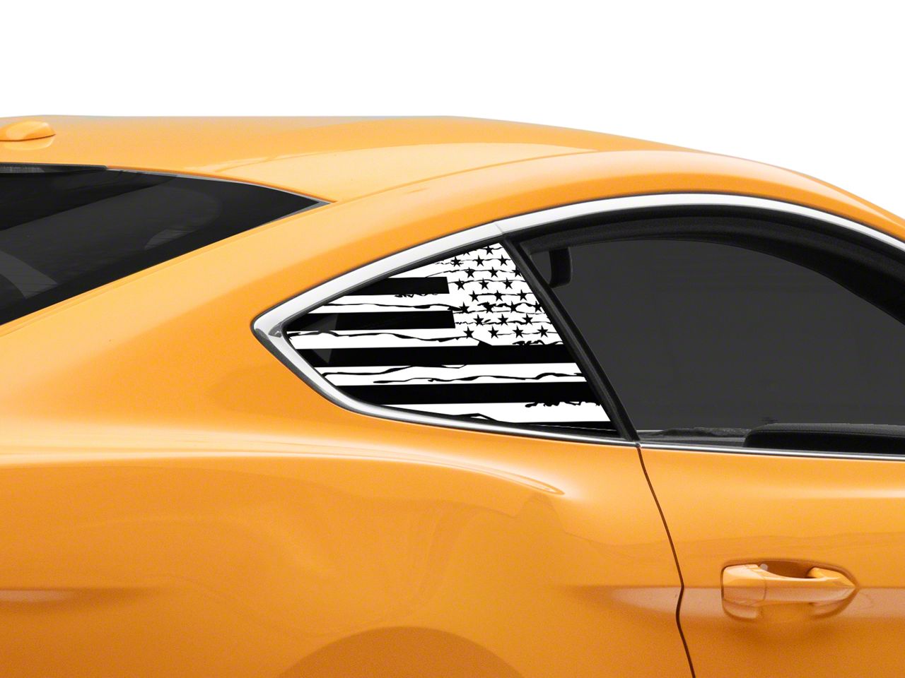 Distressed Flag Quarter Window Decals. A simple and inexpensive way to personalize the exterior styling of your Ford Mustang is with a set of SEC10 Distressed Flag Quarter Window Decals. These Decals feature a distressed American Flag design that will proudly show off your patriotism for the USA.