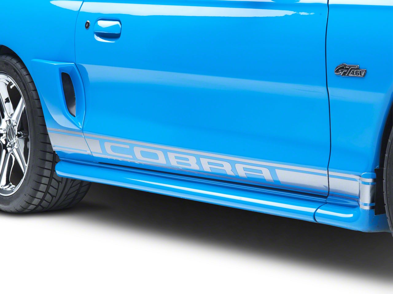 Application. These high quality Gloss Silver Vinyl Rocker Stripes with Cobra Lettering will fit any 1994 to 2004 Ford Mustang, including the V6, GT, Bullitt, Mach 1 and Cobra models.
