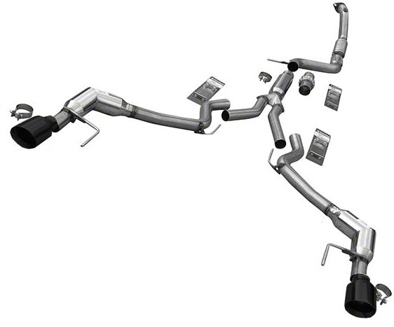 Deep Muscle Car Sound. Release the monster lurking under the hood of your 2015-2023 Ford Mustang EcoBoost Fastback with this Solo Performance Turbo Back Exhaust System with Black Tips. This kit gives your Ford Mustang a great '60s muscle car sound, using 3.00-inch diameter mandrel bent stainless steel pipes at the front end. A stamped Y-Pipe separates the tube into a pair of 2.50-inch mandrel bent kits at the rear to produce a deep and mean sound. Controlling this sound is a 200 ultra-high-flow converter with a 3.00-inch resonator at the front and cat-back portions of the kit. The rear end utilizes 2.50-inch angled resonators to help eliminate problematic RPM ranges.