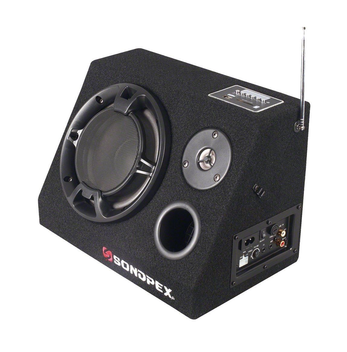 This speaker system has a built-in amplifier, woofer, and tweeter to deliver up to 200 watts of maximum output power. Listen to music from Bluetooth, FM radio, SD cards, USB drives. Or, use the RCA and AUX (3.5mm) input jacks to connect to virtually any device with those output ports.