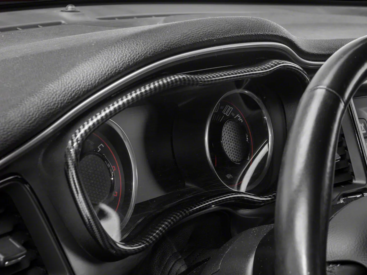 Bold, Modern Styling. A simple and effective way to add bold, modern styling to the interior of your 2015-2023 Dodge Challenger is with SpeedForm's Black Carbon Fiber Style Gauge Cluster Accent Trim. This great looking, Black Carbon Fiber Style Trim Accent is an inexpensive way to upgrade the appearance of your interior and it perfectly matches SpeedForm's complete line of other black carbon fiber interior styling parts.
