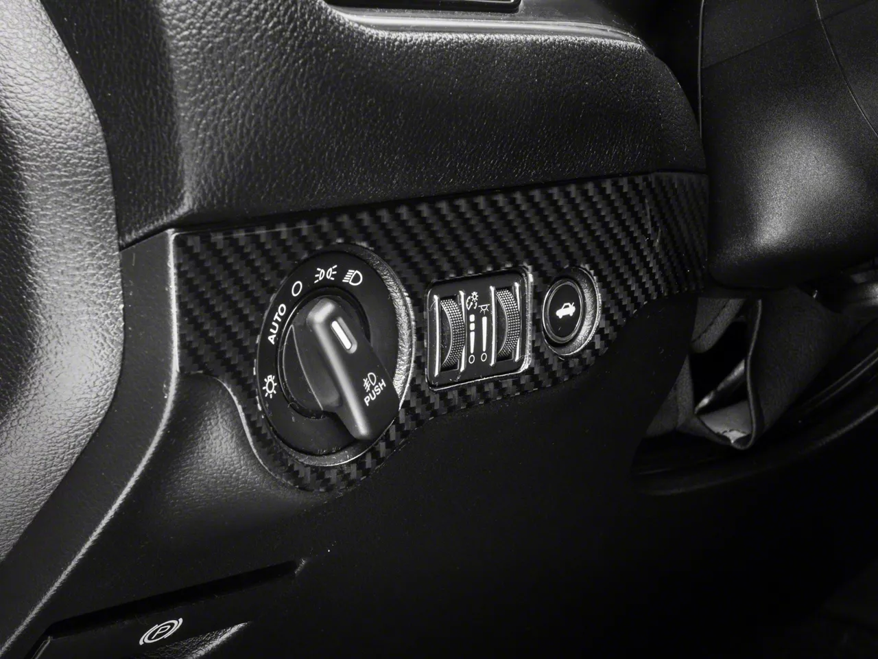 Bold, Modern Styling. A simple and effective way to add some bold, modern styling to the interior of your 2015-2023 Dodge Challenger is with SpeedForm's Carbon Fiber Headlight Switch Trim. This great looking, black Carbon Fiber Accent Trim is an inexpensive way to upgrade the appearance of your interior and it perfectly matches SpeedForm's complete line of other black carbon fiber interior styling parts.