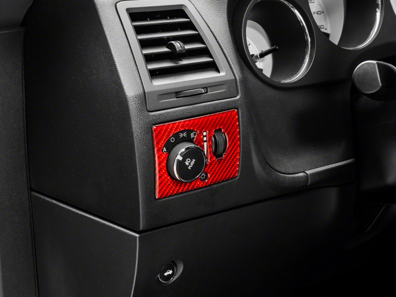 Bold, Modern Styling. A simple and effective way to add some bold, modern styling to the interior of your 2008-2014 Dodge Challenger is with SpeedForm's Carbon Fiber Headlight Switch Trim. This great looking, red Carbon Fiber Accent Trim is an inexpensive way to upgrade the appearance of your interior and it perfectly matches SpeedForm's complete line of other red carbon fiber interior styling parts.