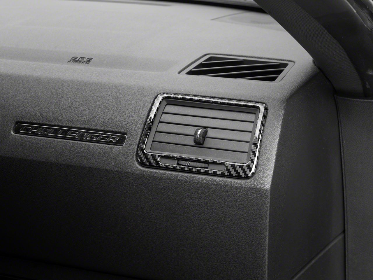 Bold, Modern Styling. A simple and effective way to add some bold, modern styling to the interior of your 2008-2014 Dodge Challenger is with SpeedForm's Carbon Fiber Passenger Side Vent Trim. This great looking, black Carbon Fiber Accent Trim is an inexpensive way to upgrade the appearance of your interior and it perfectly matches SpeedForm's complete line of other black carbon fiber interior styling parts.