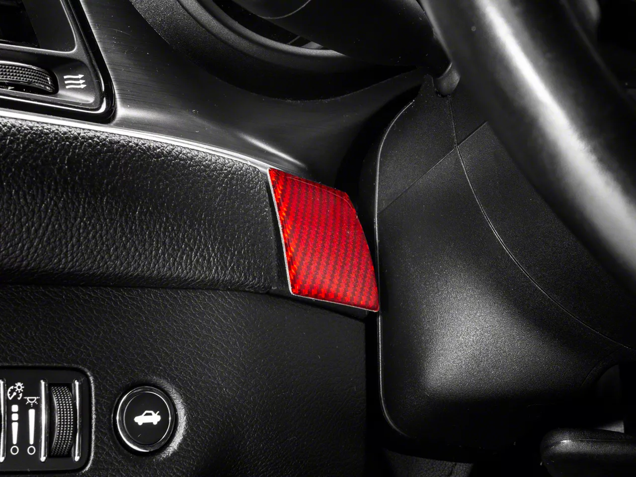 Bold, Modern Styling. A simple and effective way to add some bold, modern styling to the interior of your 2015-2023 Dodge Challenger is with SpeedForm's Carbon Fiber Steering Wheel Trim. This great looking, red Carbon Fiber Accent Trim is an inexpensive way to upgrade the appearance of your interior and it perfectly matches SpeedForm's complete line of other red carbon fiber interior styling parts.