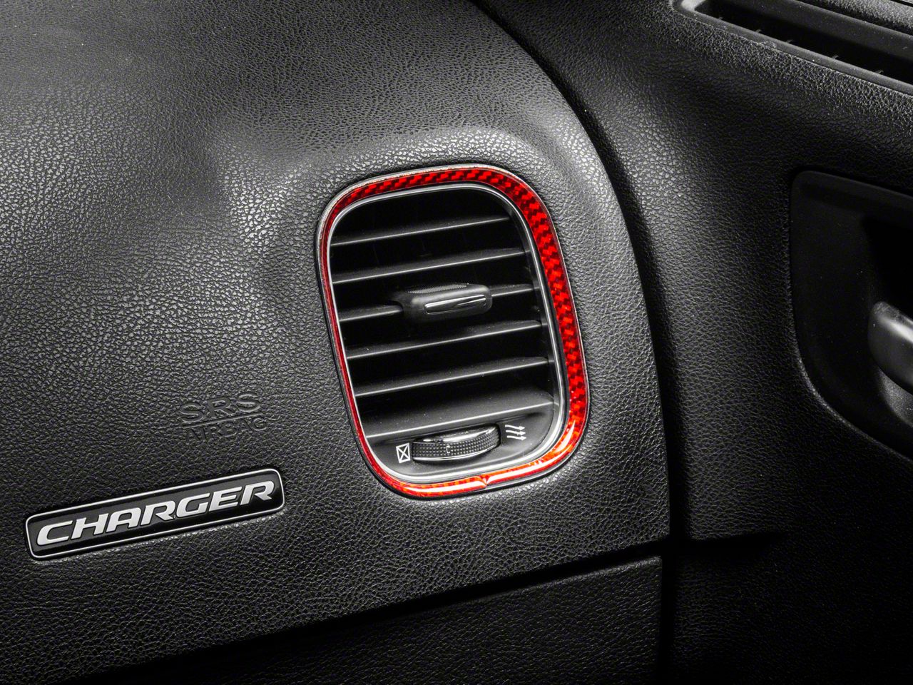 Bold, Modern Styling. A simple and effective way to add some bold, modern styling to the interior of your 2015-2023 Dodge Charger is with SpeedForm's Carbon Fiber Air Vent Trim. This great looking, red Carbon Fiber Accent Trim is an inexpensive way to upgrade the appearance of your interior and it perfectly matches SpeedForm's complete line of other red carbon fiber interior styling parts.