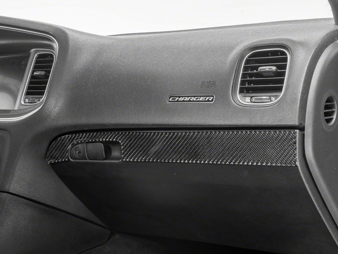 Bold, Modern Styling. A simple and effective way to add some bold, modern styling to the interior of your 2015-2023 Dodge Charger is with SpeedForm's Carbon Fiber Glove Box Trim. This great looking, black Carbon Fiber Accent Trim is an inexpensive way to upgrade the appearance of your interior and it perfectly matches SpeedForm's complete line of other black carbon fiber interior styling parts.