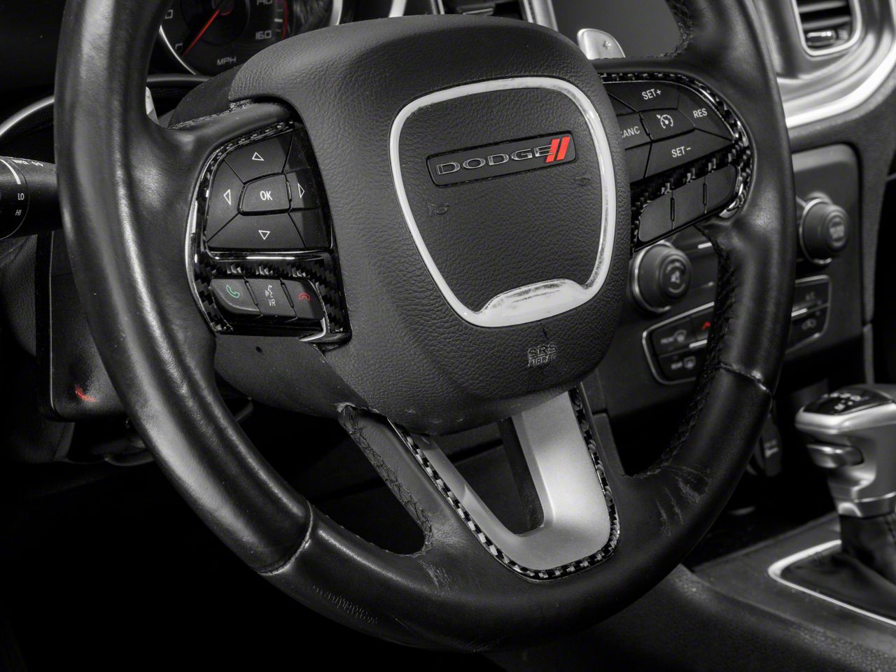 Bold, Modern Styling. A simple and effective way to add some bold, modern styling to the interior of your 2015-2023 Dodge Charger is with SpeedForm's Carbon Fiber Steering Wheel Trim. This great looking, black Carbon Fiber Accent Trim is an inexpensive way to upgrade the appearance of your interior and it perfectly matches SpeedForm's complete line of other black carbon fiber interior styling parts.