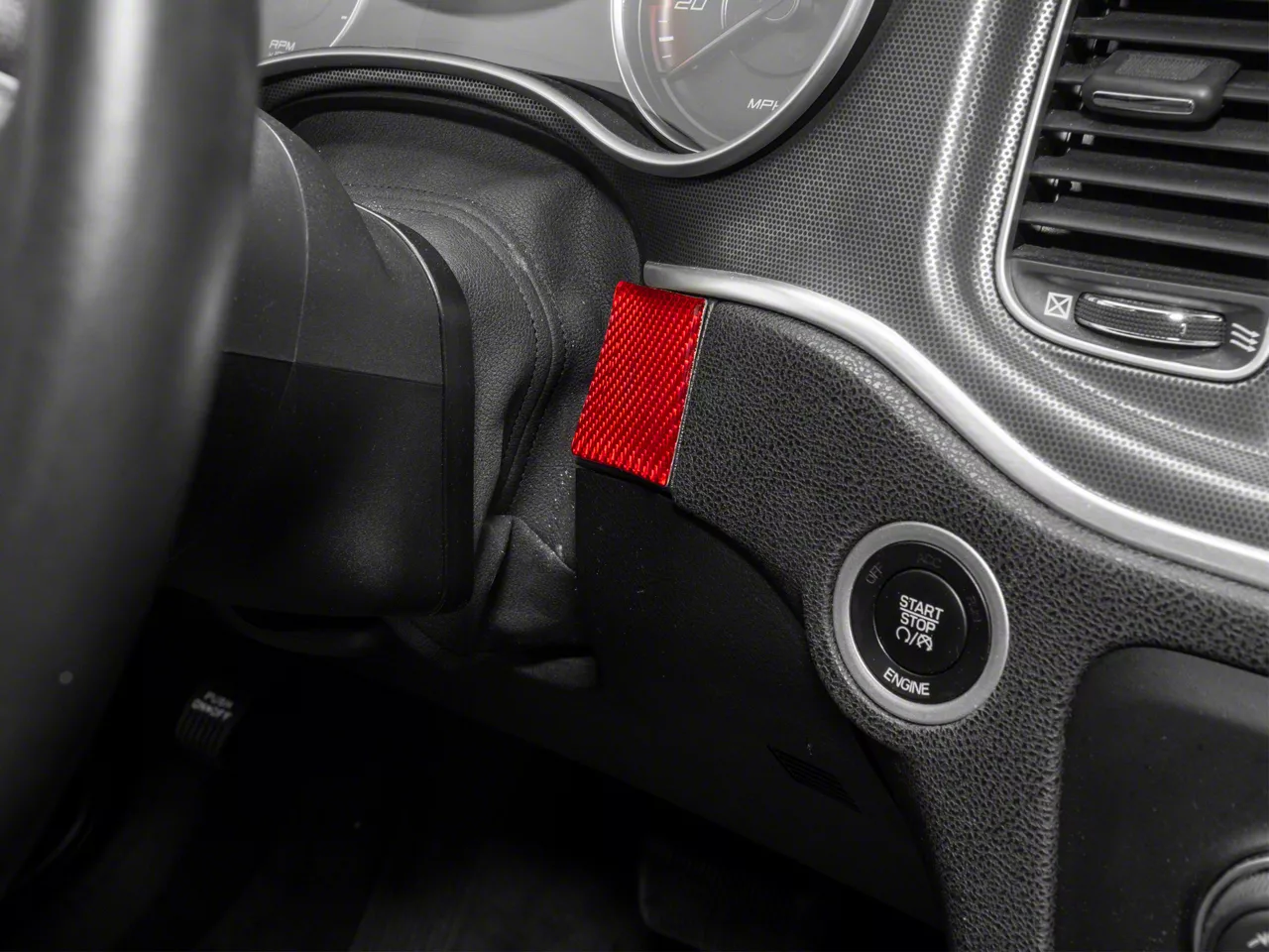 Bold, Modern Styling. A simple and effective way to add some bold, modern styling to the interior of your 2015-2023 Dodge Charger is with SpeedForm's Carbon Fiber Steering Wheel Trim. This great looking, red Carbon Fiber Accent Trim is an inexpensive way to upgrade the appearance of your interior and it perfectly matches SpeedForm's complete line of other red carbon fiber interior styling parts.