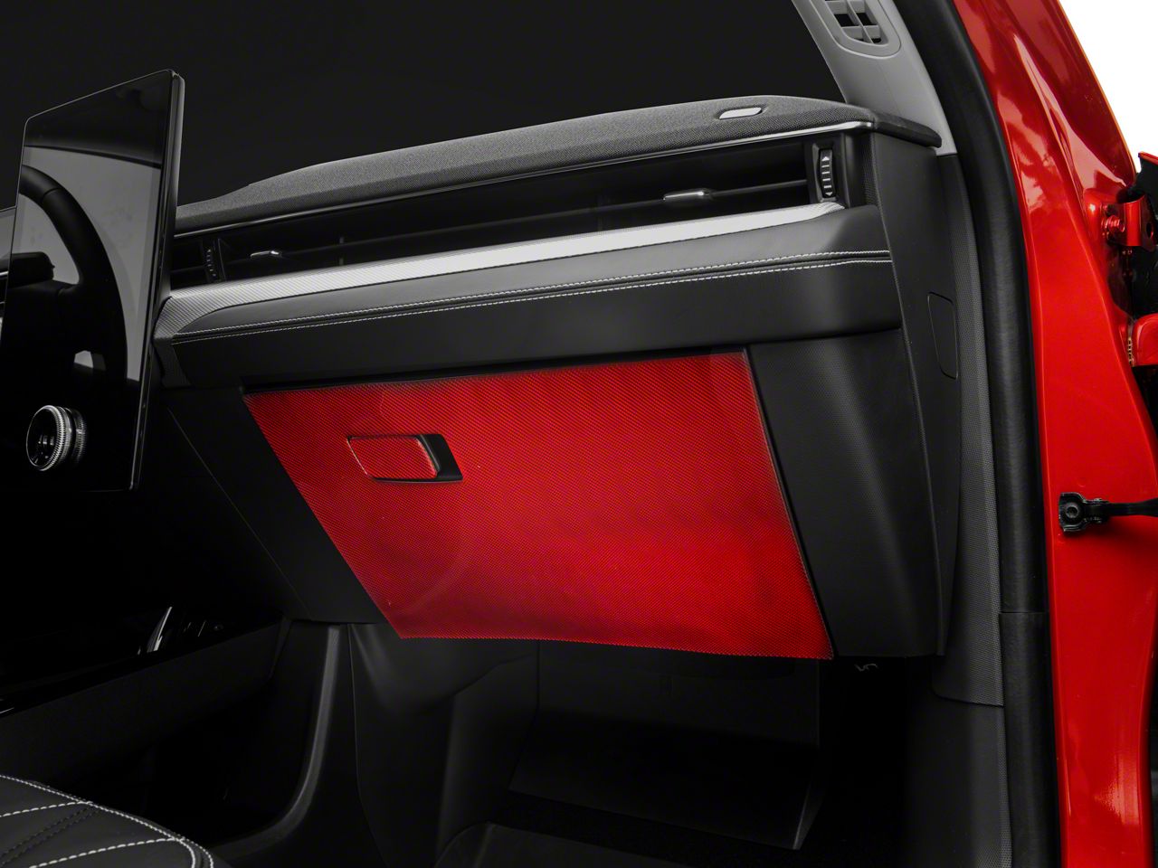 Application. This SpeedForm Glove Box Trim; Red Carbon Fiber is designed to fit 2021-2025 Ford Mustang Mach-E models.