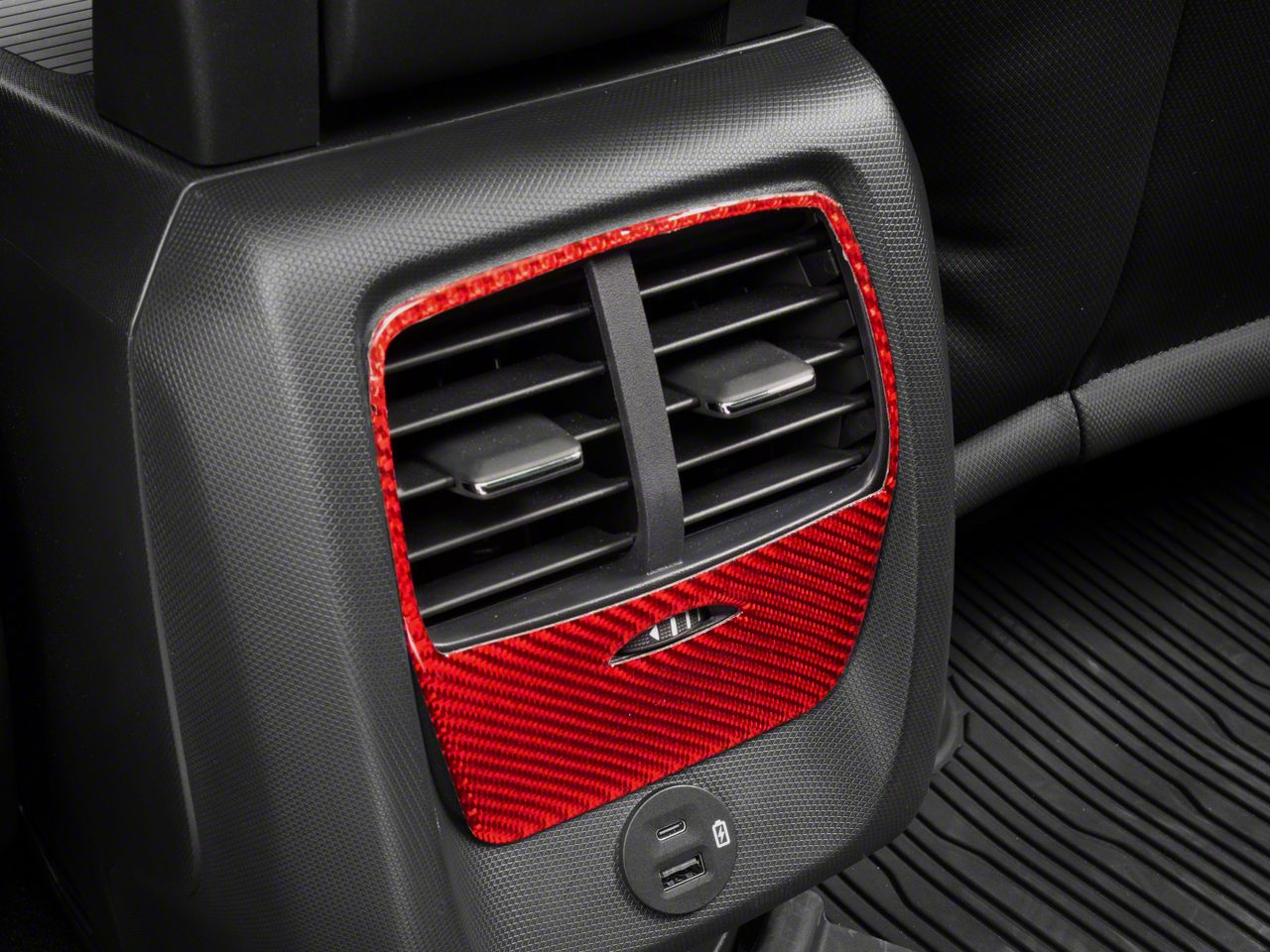 Bold, Modern Styling. A simple and effective way to add some bold, modern styling to the interior of your 2021-2025 Ford Mustang Mach-E is with SpeedForm's Red Carbon Fiber Rear Console Air Vent Trim Accent. This great looking, red Carbon Fiber Accent Trim is an inexpensive way to upgrade the appearance of your interior and it perfectly matches SpeedForm's complete line of other red carbon fiber interior styling parts.