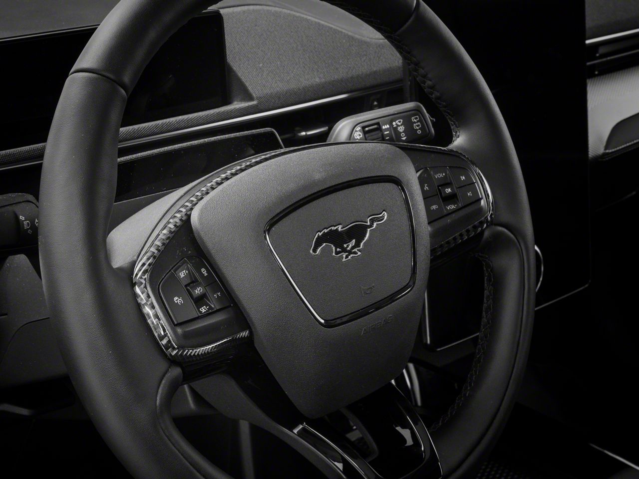 Bold, Modern Styling. A simple and effective way to add some bold, modern styling to the interior of your 2021-2025 Ford Mustang Mach-E is with SpeedForm's Carbon Fiber Steering Wheel Trim. This great looking, black Carbon Fiber Accent Trim is an inexpensive way to upgrade the appearance of your interior and it perfectly matches SpeedForm's complete line of other black carbon fiber interior styling parts.
