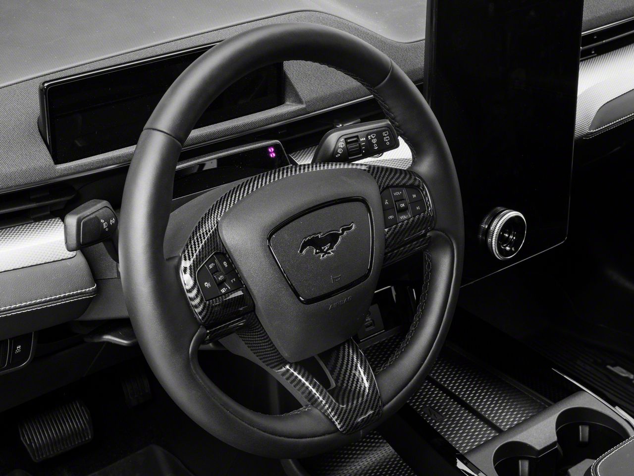 Bold, Modern Styling. A simple and effective way to add bold, modern styling to the interior of your 2021-2025 Ford Mustang Mach-E is with SpeedForm's Black Carbon Fiber Style Steering Wheel Trim. This great looking, Black Carbon Fiber Style Trim is an inexpensive way to upgrade the appearance of your interior and it perfectly matches SpeedForm's complete line of other black carbon fiber interior styling parts.