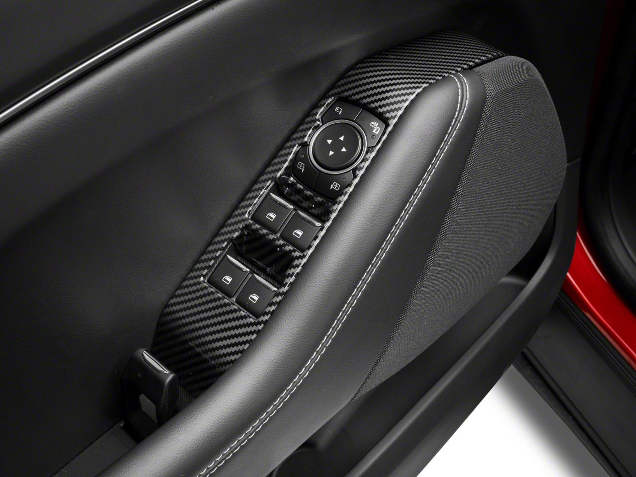Bold, Modern Styling. A simple and effective way to add bold, modern styling to the interior of your 2021-2025 Ford Mustang Mach-E is with SpeedForm's Black Carbon Fiber Style Window Switch Accent Trim. This great looking, Black Carbon Fiber Style Trim is an inexpensive way to upgrade the appearance of your interior and it perfectly matches SpeedForm's complete line of other black carbon fiber interior styling parts.