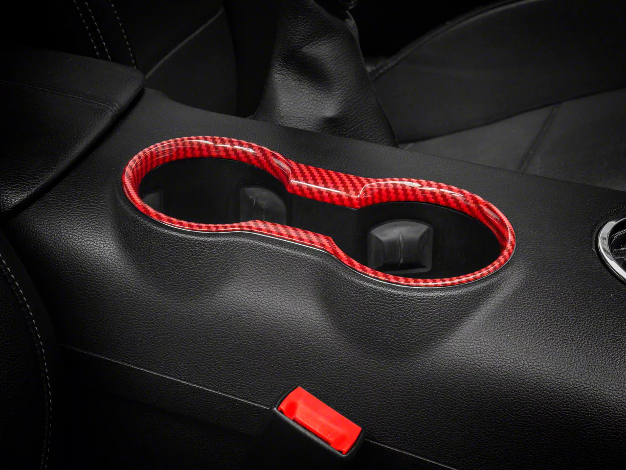 Bold, Modern Styling. A simple and effective way to add bold, modern styling to the interior of your 2015-2023 Ford Mustang is with a SpeedForm Red Carbon Fiber Style Center Console Cup Holder Trim Accent Bezel. This great looking, red Carbon Fiber Style Trim Accent is an inexpensive way to upgrade the appearance of your interior and it perfectly matches SpeedForm's complete line of other red carbon fiber interior styling parts.