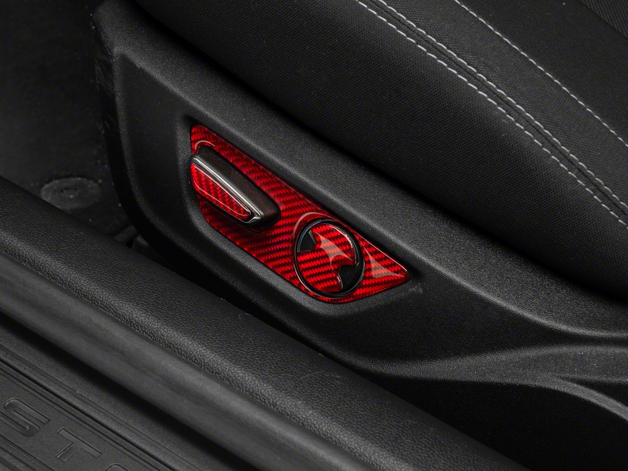 Bold, Modern Styling. A simple and effective way to add some bold, modern styling to the interior of your 2015-2023 Ford Mustang is with SpeedForm's Carbon Fiber Seat Adjustment Trim. This great looking, red Carbon Fiber Accent Trim is an inexpensive way to upgrade the appearance of your interior and it perfectly matches SpeedForm's complete line of other red carbon fiber interior styling parts.