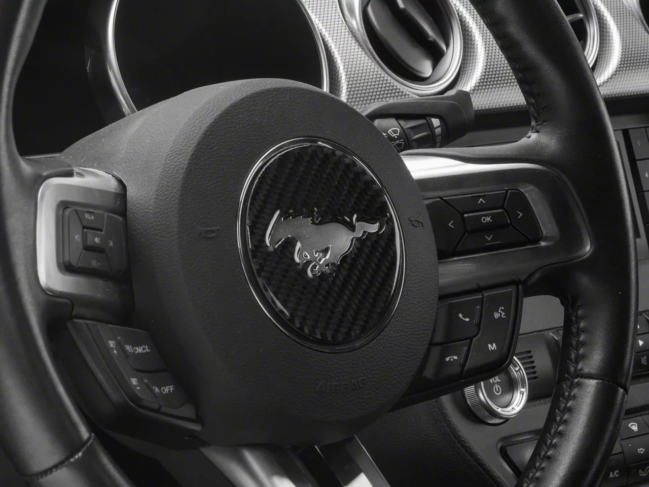 Bold, Modern Styling. A simple and effective way to add some bold, modern styling to the interior of your 2015-2023 Ford Mustang is with SpeedForm's Carbon Fiber Steering Wheel Trim. This great looking, black Carbon Fiber Accent Trim is an inexpensive way to upgrade the appearance of your interior and it perfectly matches SpeedForm's complete line of other black carbon fiber interior styling parts.