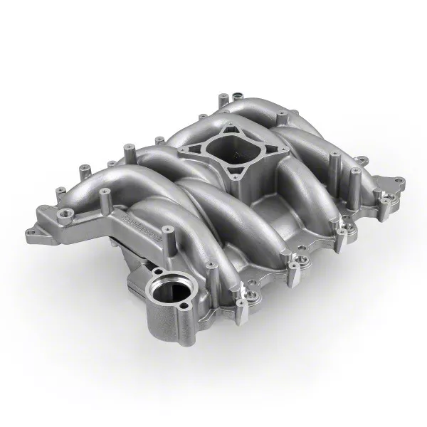 Construction and Appearance. Made from durable aluminum, this intake manifold has a polished finish that provides a clean, high-quality look. It includes removable runners and a complete intake section designed to meet OEM standards, ensuring reliable function.