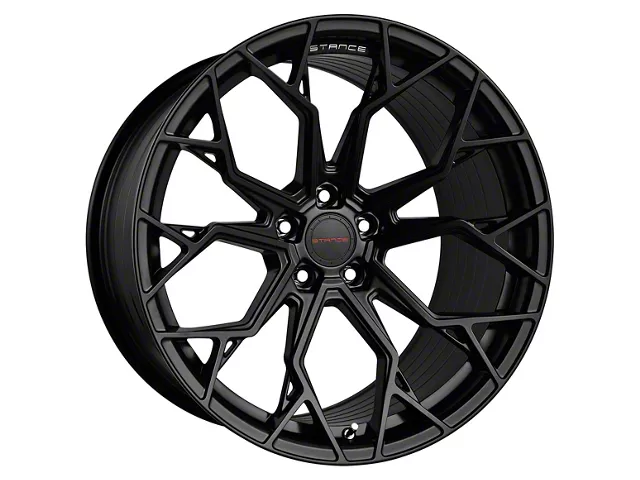 Stance Wheels SF10 Matte Black Wheel; 20x10 offers a striking balance between style and durability. The design speaks to the brand's commitment to quality, enhancing the vehicle's appearance with its distinct look. This wheel, with its unique aesthetics, is ideal for drivers who appreciate a blend of modern design and robust functionality.