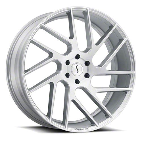 Status Juggernaut Silver with Brushed Machined Wheel; 22x9.5. The Status Juggernaut Silver with Brushed Machined Wheel offers a striking balance of style and refinement. Its unique design accentuates the vehicle's aesthetic, while the premium construction underscores its robust nature. This wheel is a perfect choice for those seeking both elegance and a strong visual statement.
