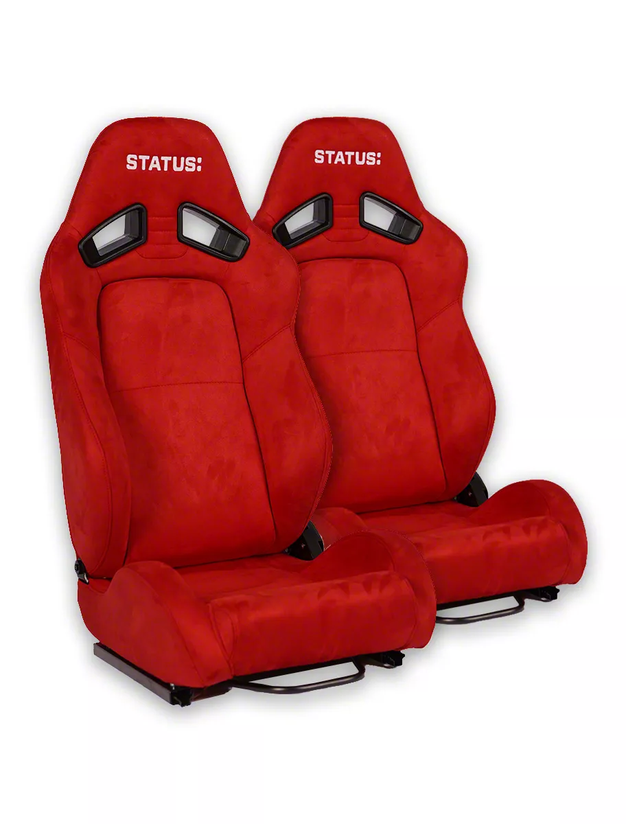 Top Quality Structure. The Status RTX Reclining Seats are the epitome of style, comfort, and performance for automotive enthusiasts. Crafted from premium suede, these seats not only offer a luxurious and tactile experience but also exude a sleek and sophisticated red design that enhances the interior of your vehicle. With a design that accommodates individuals with up to a 38-inch waist, these seats provide excellent support and comfort during even the most spirited drives. They are engineered to resist wear and tear, ensuring longevity and durability, even in high-performance or daily driving scenarios.