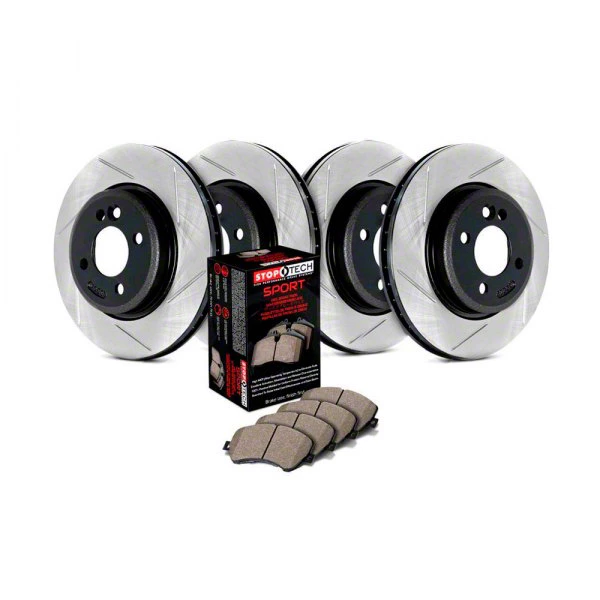 Performance Brake Kit. The StopTech Sport Axle Slotted Brake Rotor and Pad Kit offers exceptional braking performance for both front and rear placements. This kit is designed to reduce dust and noise, ensuring a smooth and quiet ride. It integrates seamlessly with factory parts, providing a perfect upgrade for your vehicle's braking system.