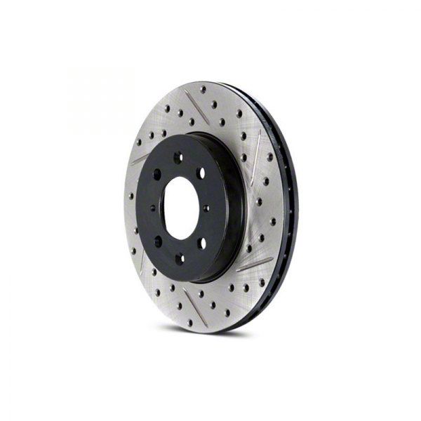 Description. StopTech Drilled and Slotted Sport Rotors are 1-piece direct replacement brake discs for factory brake systems and stock calipers that look great behind your wheels ΓÇô and offer significantly improved braking performance. The unique cross-drilling and slotting aids with heat and brake dust dispersal; prevents glazing of the pads; adds bite and improves wet and dry braking performance. Built to last; the black e-coating provides protection from corrosion and the high carbon metallurgy (in most applications) offers quieter operation; better crack resistance and increased performance.