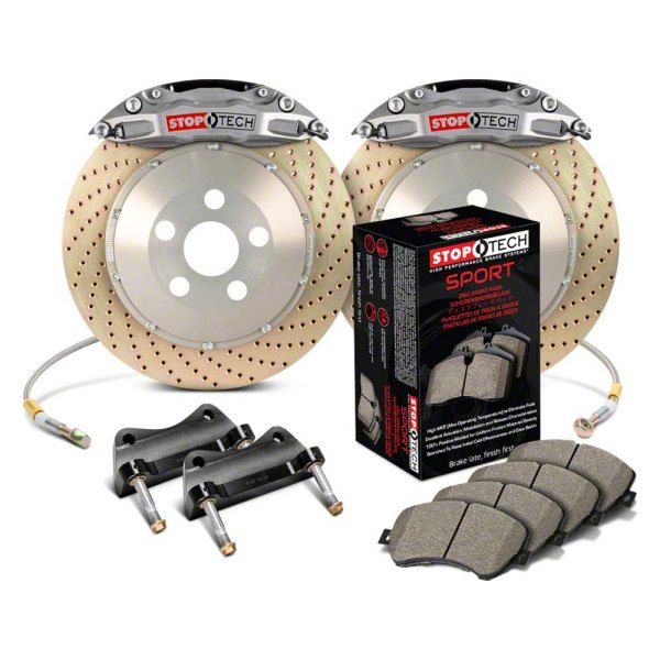 The ultimate street braking system; with naturally anodized lightweight components adapted from our racing program. They use the same STR calipers; AeroRotors and AeroHats as the Trophy Race BBKs; but add silicone dust boots to extend service intervals and anti-rattle rotor mounting hardware for quieter street operation. They also include StopTech Street Performance brake pads for high performance street and occasional track use; and StopTech Stainless Steel Lines. Any StopTech BBK can be ordered as a Trophy Sport Kit by specifying it on the order form.