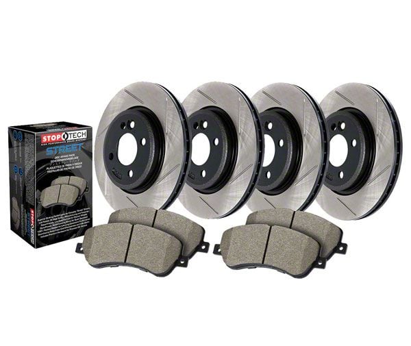 High Performance Brake Kit. Drive and stop your Mustang like you've never before with this StopTech Street Axle Slotted Brake Rotor and Pad Kit; Front and Rear. This Brake Kit integrates the StopTech slotted rotors with the lower dust and low noise capabilities of the 308 street brake pads to give you a system improvement that efficiently handles heat while improving dust and noise levels.