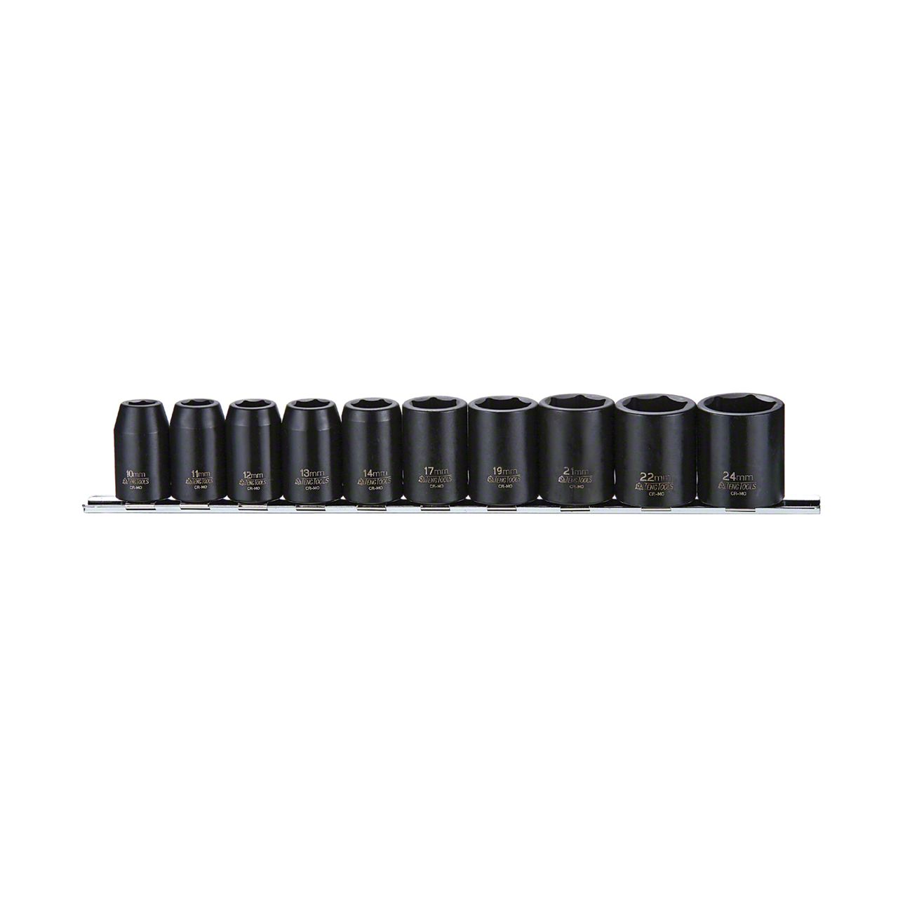 1/2 Inch Drive impact socket set containing 10 regular sockets Sizes: 10, 11, 12, 13, 14, 17, 19, 21, 22, 24mm. 6 point impact sockets supplied on a clip rail. The sockets are exceed ANSI standard and are suitable for automotive use. All sockets are marked with the size for quick identification. Manufactured of chrome molybdenum according to GGG-W-6608 to guarantee the highest standard.)