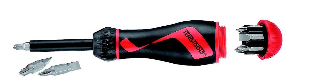 Ratcheting bits driver set supplied with 7 double ended screwdriver bits The bits driver features a magnet that holds the screw (steel, etc.) as well as the bit Reversible ratchet with forward, reverse and fixed settings Bi-material handle with storage in the handle for bits Bits included: Slotted 4 & 6mm PH0, PH1, PH2, PH3 PZ0, PZ1, PZ2, PZ3 TX10, TX15, TX20, TX25