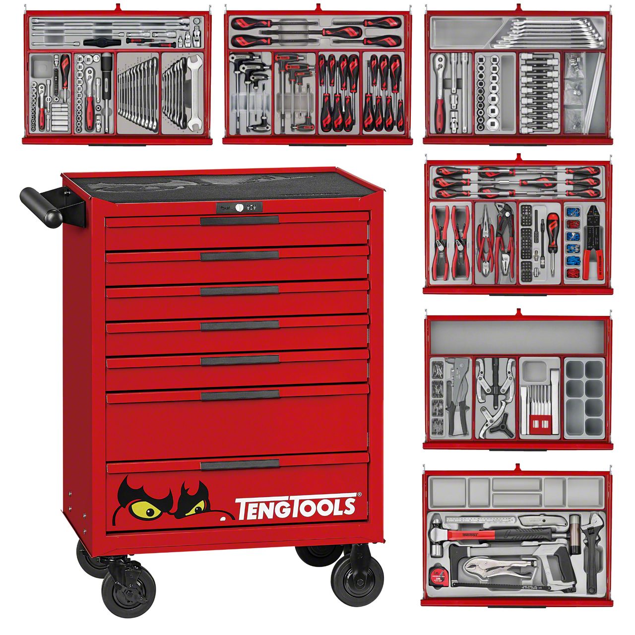 [ 516 PIECES ] The red mixed mechanics general hand tool kit contains 27 tool trays with 516 individual tools. Say goodbye to cluttered workspaces and hello to streamlined productivity. [ 7 DRAWER TOOL BOX ] Supplied with a red 26 inch wide 7 drawer roller cabinet (TSW26R7). [ BUILT TO LAST ] The tool box is crafted with a robust 3-piece heavy gauge steel cabinet frame, fortified with our advanced 5-step phosphate-free rust protection, features a new reinforced fully extendable drawer design which is capable of holding up to 88 lbs, a flexible security locking option allowing you to secure your tools by switching between combination and key locks depending on your preference, flat aluminum drawer front handles with space for labelling for quick tool identification, foam worktop mat, comfort grip handles ergonomically designed for ease of movement which can be used with a side shelf to create extra space for storing longer items conveniently at your side (side shelf sold separately), foam mats supplied in each drawer to protect loose tools, 3-step ball bearing sliders to ensure a smooth and reliable opening and closing action every time and heavy-duty castors (two swivel and two fixed, with brakes) to navigate your workspace with ease. [ TOTAL TOOL ORGANIZATION ] The tools are supplied in unique tool trays which feature removable lids and dovetail joints. The trays can be used on their own as standalone sets or as part of our Get Organized system where every tray clicks together and fits perfectly in the tool box. [ INCLUDED PRODUCTS ] See INCLUDED PRODUCTS and DOWNLOADS area below for the complete list of tool contents and specifications.
