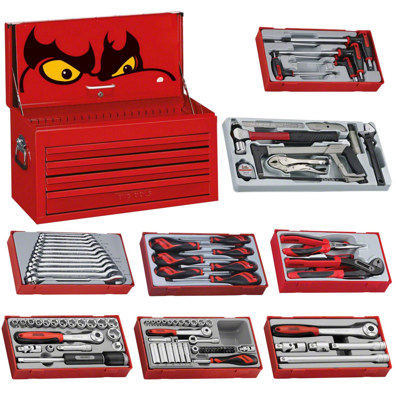 [ 115 PIECES ] This tool kit contains 9 tool trays with 115 individual tools. [ 4 DRAWER TOP BOX ] Supplied with a 26 inch wide 4 drawer top box (TC804EV). [ BUILT TO LAST ] The tool boxes are manufactured from heavy gauge, top quality steel with a 5-step rust prevention and undercoat, feature comfortable handles, 5 inch castor wheels (two swivel and two with brakes) for strength and stability, drawers equipped with robust 3-step ball bearing slides allowing them to be fully extended for greater access to tools and a key locking system for increased security. [ TOTAL TOOL ORGANIZATION ] The tools are supplied in unique tool trays which feature removable lids and dovetail joints. The trays can be used on their own as standalone sets or as part of our Get Organized system where every tray clicks together and fits perfectly in the tool box. [ SOCKETRY ] 1/4, 3/8 & 1/2 inch drive shallow/regular and deep metric sockets and accessories.[ WRENCHES ] Metric combination wrenches.[ SCREWDRIVERS ] Slotted/flat, PH & PZ type screwdrivers.[ PLIERS ] Side cutters, linesman, long nose, locking and slip joint pliers.[ + MORE ] Hammers, hacksaw, knife, measuring tape and steel rule (see INCLUDED PRODUCTS section below for full details).