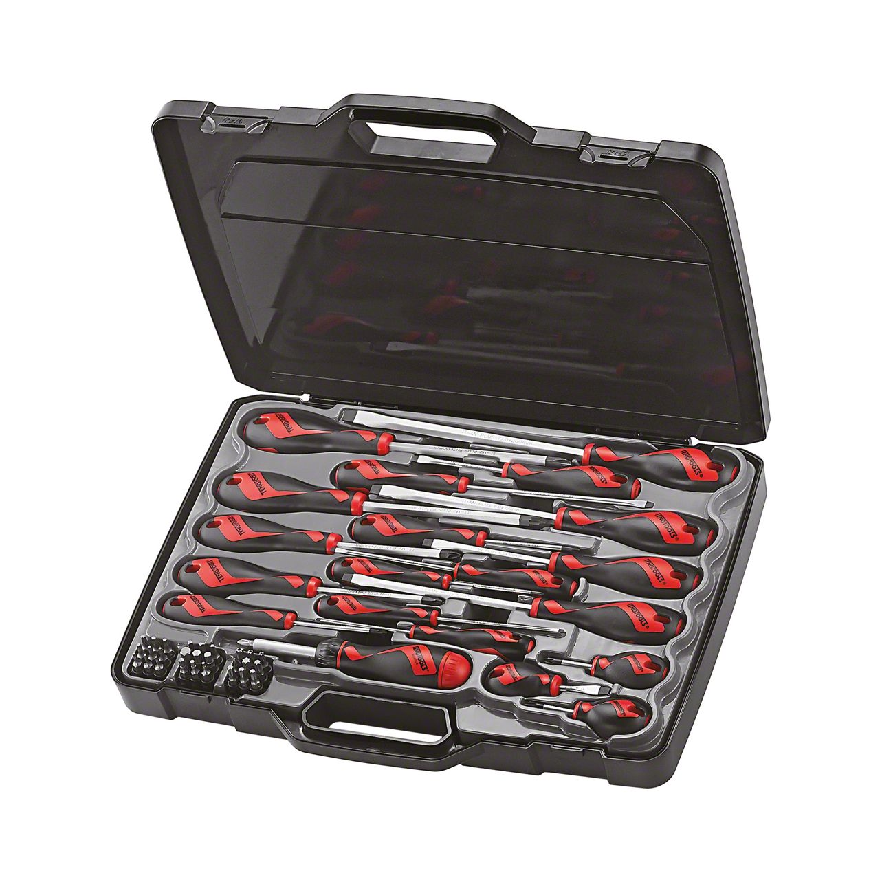53 piece Flat, PH, PZ, Hex, Torx, TPX and Square type screwdriver and accessory set. Accessories: 1/4 hex x 1/4 square drive adapter, ratcheting bits driver. Flat Screwdrivers: 3.0 x 75mm, 3.0 x 100mm, 4.0 x 100mm, 5.5 x 75mm, 5.5 x 150mm, 6.0 x 38mm, 6.5 x 100mm, 6.5 x 150mm, 8.0 x 150mm, 10.0 x 200mm. Phillips Screwdrivers: PH1 x 75mm, PH2 x 38mm, PH2 x 100mm, PH3 x 150mm. Pozidriv Screwdrivers: PZ0 x 75mm, PZ1 x 75mm, PZ2 x 38mm, PZ2 x 100mm, PZ3 x 150mm. 25mm Bits: 1.2 x 5mm, 1.4 x 7mm flat, PH1, PH2, PZ0, PZ1, PZ2, TX6, TX7, TX8, TX9, TX10, TX15 (x2), TX20 (x2), TX25 (x2), TX30, TX40, TPX20, TPX25, TPX30, ROB1, ROB2, ROB3, 2, 3, 4, 5, 6, 8mm hex. TT-MV PLUS steel alloy for greater strength and material flexibility. Ergonomically designed bi-material handles for easy use with higher torque and faster speed. Hole in the handles for hanging or for use with a T handle for extra torque or with a fall protection wire if needed. The handles are moulded around the blades to ensure straightness and to allow larger blade wings which give a higher torque capacity. Supplied inn a handy carrying case.