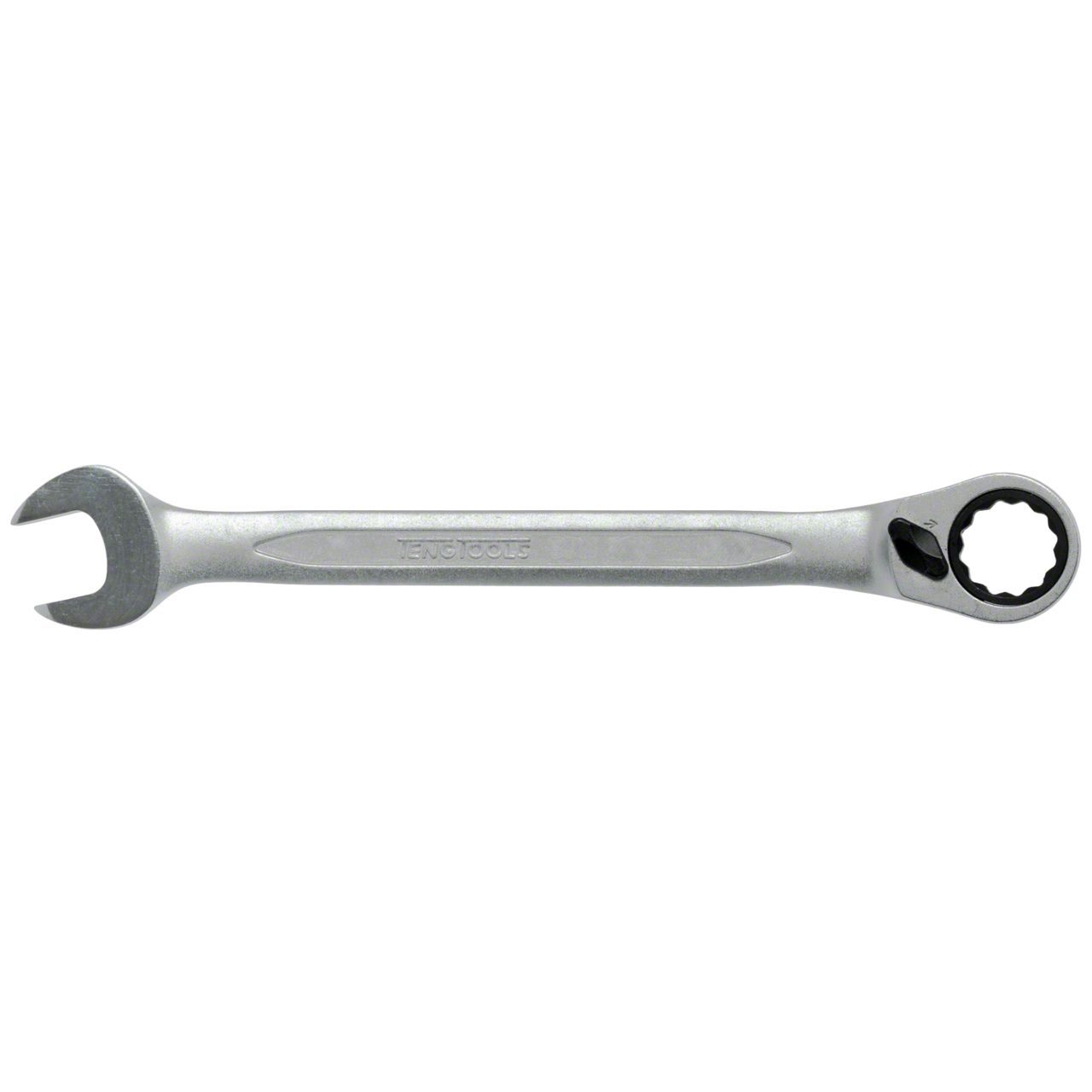 SAE ratcheting combination ring/open ended spanner with 72 teeth and 12 point ring ratchet with flip reverse. The spanner is offset at a 13 degrees angle and has the same size at both ends. Made from chrome vanadium with a satin finish)