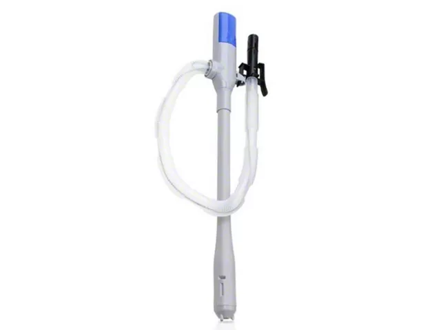 Description. Works With Gas Can Use For Gasoline/ Kerosene/ Diesel/ Light Oils And Non-Potable Water 2.4 Gallons Per Minute Battery Operated With 15-1/2 Inch Length Rigid Intake Hose/ 18 Inch Length Discharge Hose And 4-1/2 Inch Nozzle Built-In Auto Stop Sensor Requires 2 Aa Batteries