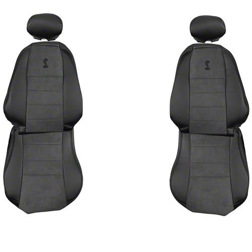 Direct Replacement. Made for the Ford Mustang Cobra models this TMI SVT Cobra Sport Seat Upholstery Kit comes in a dark charcoal finish. Built from a mix of vinyl and UniSuede, this front seat upholstery kit has a Cobra logo design with a comfortable feel and is meant to directly replace your worn out, broken, or ruined stock seat upholstery.
