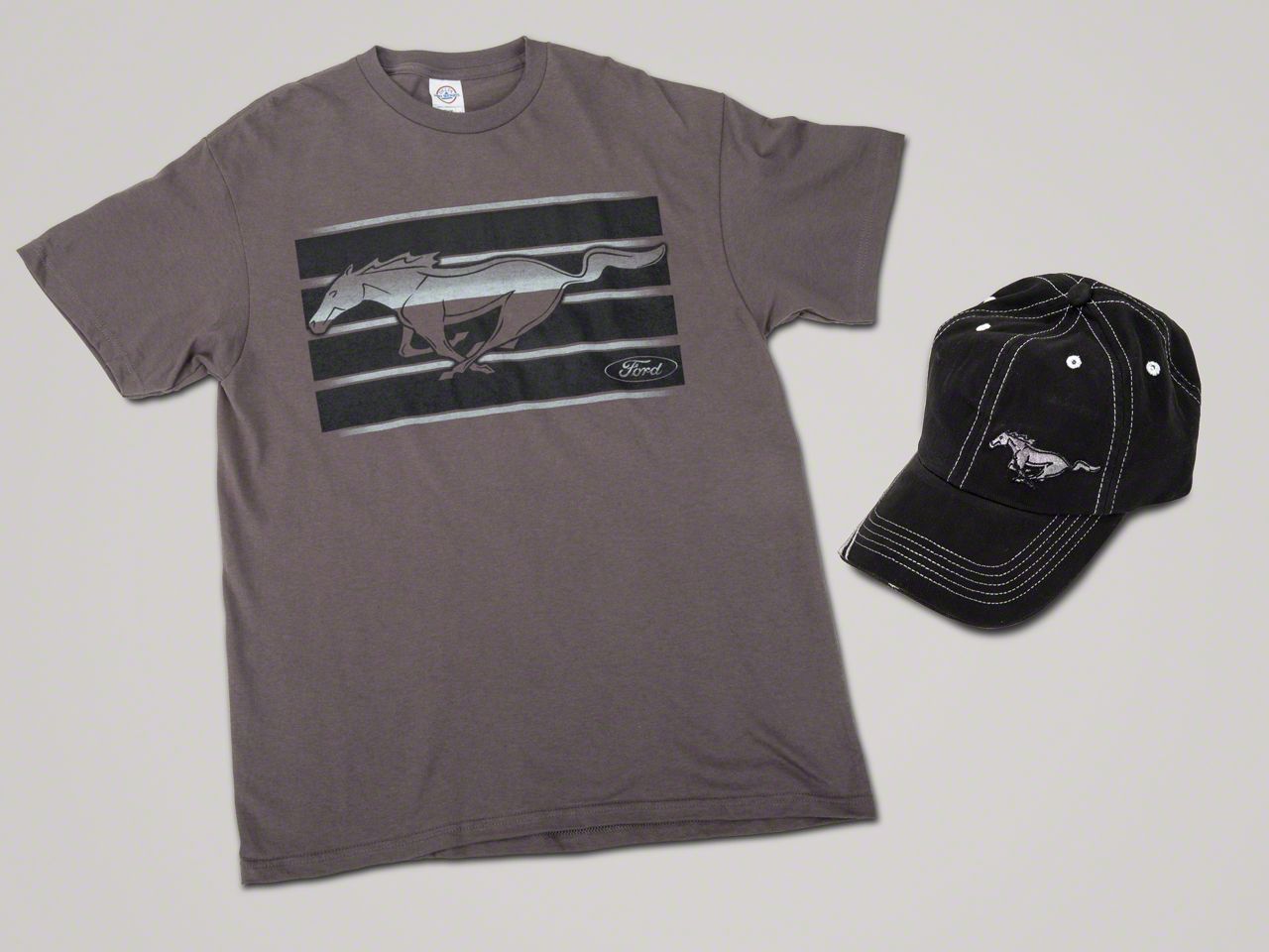 Pony Pride Pack. Show off your Mustang pride with a this great looking t-shirt and hat combo. The gray short-sleeve t-shirt features the Running Pony logo across the front of the chest and the included black baseball cap has the Running Pony on the front with the Ford oval on the back. This hat and t-shirt will show everyone that you bleed True Ford Blue.