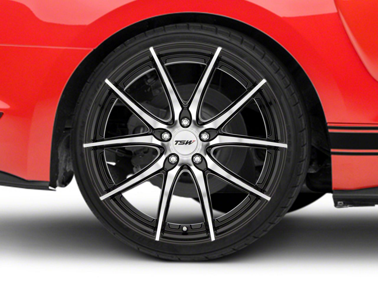 Application. This TSW Spring Gloss Black with Mirror Cut Face Wheel; 20x10, with a backspace of 7.075 Inch, 179.8mm and a bolt pattern of 5 x 114.3mm (5 x 4.5-Inch), is designed to enhance alignment and driving stability. It's specially designed to fit the 2015-2023 Mustang Pack, V6 models, sold individually.