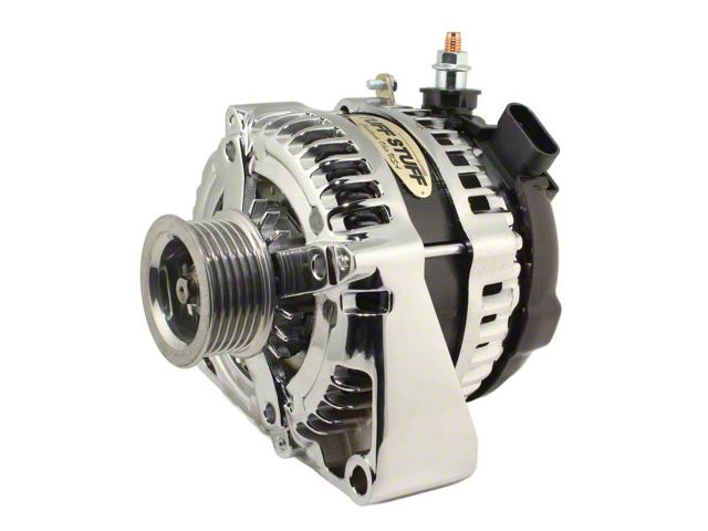 Construction and Appearance. This alternator features a six-groove pulley for proper serpentine belt alignment and smooth operation. The chrome-plated finish adds a show-quality look while protecting against corrosion and heat. It shares the same compact form factor as Tuff Stuff models 8206 and 8242, ensuring a reliable fit in tight engine bays or custom setups.