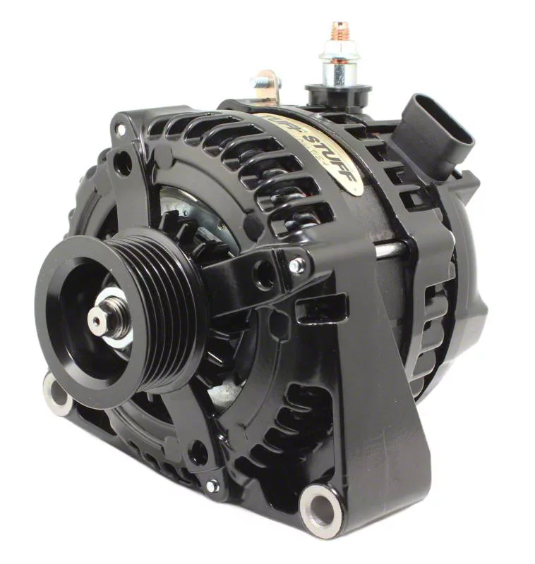 Construction and Appearance. Featuring a sleek stealth black finish, this alternator is built for durability and heat resistance under demanding conditions. It includes a 6-groove pulley and is crafted with precision components to ensure consistent charging performance. The clean design complements a variety of engine bay styles, particularly in custom and performance builds.
